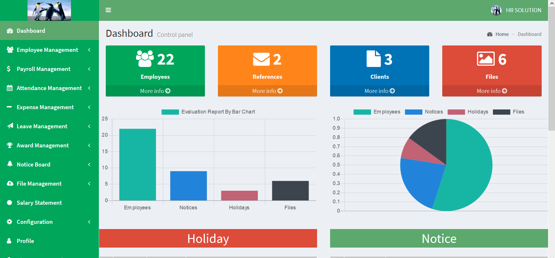 Customize salary Statement, Complete payroll management with report, Award management, Leave management with report Employee role management, Notice board management, Holiday management, Complete expanse management with report.