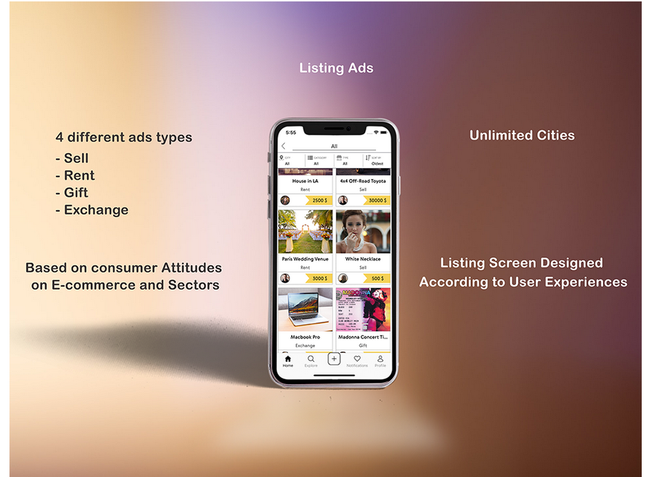User Profile :- View her/his ads , View feedback, Report, Advance Search, Advance Filters, Browsing ads by Category, City or Type, Sort ads by Newest, Oldest, Maximum Price, Minimum Price and Most Popular. Advance Push Notifications Advance Verification Email System Social Media Login and Register.